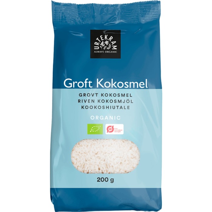Urtekrams grova kokosmjöl passar utmärkt till kakor och konfekt, men också till smoothies och om du vill ha ett sött inslag i frukostgröten.