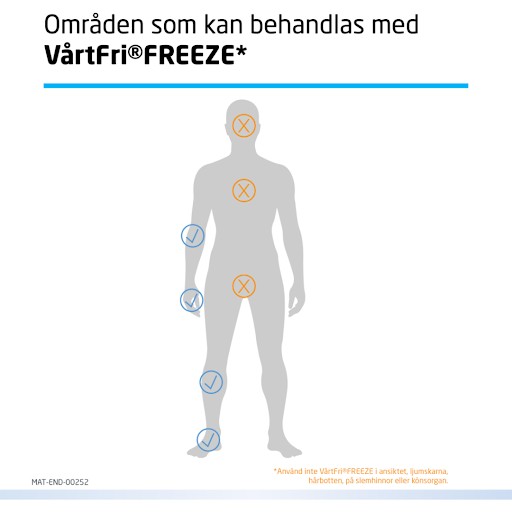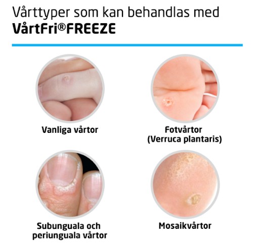 Vid användning ger VårtFri Freeze en stickande känsla och huden kan kännas öm. Detta bör gå över på några timmar. Genast efter behandlingen blir det behandlade området vitt. Efter en liten stund återfår huden sin normala färg och vårtan blir röd. Inom några minuter upp till flera dagar efter frysningen kan blåsor bildas, ibland blodblåsor. Stick inte hål på blåsorna. Vid behov skydda blåsorna med steril kompress. Om blåsan spricker desinficera noga. Den behandlade vårtan försvinner långsamt efter 10-14 dagar. Hållbarhet i kylskåp efter första användningen: 2 månader. Räcker upp till 6 behandlingar. Ofta räcker 1 behandling. När ska VårtFri Freeze inte användas? På barn under 4 år I ansiktet, i ljumskarna, på genitalier, hårbotten eller slemhinnor På frisk hud (hud utan vårtor) På vårtor på känslig hud och var särskilt försiktig då du behandlar vårtor på tunn hud Om vårtan och/eller huden runtomkring vårtan har ett öppet sår eller blöder, är irriterad, kliar, är infekterad eller röd Om du är osäker på om det är en vanlig vårta, rådgör med din läkare På födelsemärken, liktornar, blåsor, andra hudförändringar eller något som kan vara hudcancer (melanom) På vätskefyllda blåsor på huden (kallas mollusker) eller andra blåsor På gravida eller ammande kvinnor På personer med diabetes och/eller personer som har problem med blodcirkulation eller blodkoagulering På flera vårtor samtidigt, om vårtorna är närliggande. Vänta i 14 dagar innan du behandlar nästa vårta.