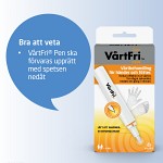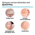 VårtFri Pen är en lättanvänd penn-applikator för borttagning av vårtor hemma. VårtFri är ett effektivt och lättanvänt vårtmedel för både barn och vuxna. VårtFri Pen torkar effektivt ut vårtor på händer, fötter, armbågar och knän. Absorberas direkt in i vårtan och lämnar inga spår på huden. Använd en gång i veckan. Vanligtvis behövs 5-15 behandlingar. VårtFri Pen räcker till ca 30 behandlingar. Kan användas vid behandling av flera vårtor. Kan användas till både barn och vuxna. (Kontakta läkare eller BVC innan behandling av barn under 4 år.)