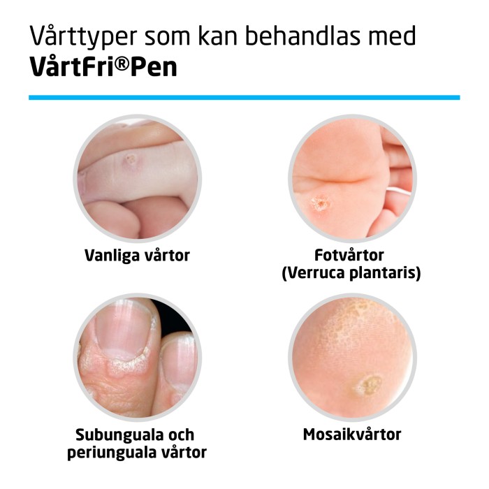Vårtor orsakas av virus och smittar både vid direktkontakt och till exempel via golv. VårtFri Pen är en effektiv vårtborttagning som kan användas av hela familjen. Rådgör alltid med din läkare eller barnläkaren innan du behandlar ett barn som är under 4 år, eftersom vårtor ibland misstas för andra vanliga virusinfektioner som till exempel mollusker. Läs bruksanvisningen noga före användning. Förvaras utom syn- och räckhåll för barn.