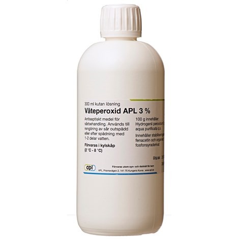 Väteperoxid används till rengöring av sår outspädd eller efter spädning med 1-2 delar vatten. Styrka 3% Förvaras vid 2-8°C (i kylskåp).