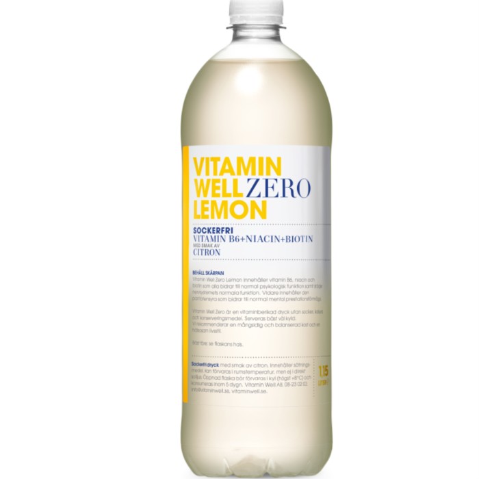 Vitamin Well Zero Lemon är en vitaminberikad sockerfri dryck utan kolsyra. Denna dryck har en smak av citron. Innehåller sötningsmedel.