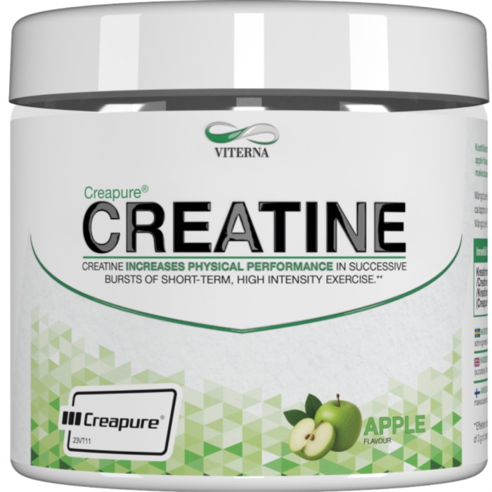 Viterna Crepure Creatine Apple är ett pulver med 100 % Creapure® av tysk kvalitet med smak av äpple. Creapure® är tillverkat i Tyskland under farmaceutisk kontroll. Kreatin är en av de mest studerade prestationshöjande substanserna. Kreatin bidrar till ökad fysisk prestationsförmåga vid upprepad, kortvarig och högintensiv träning – en effekt som uppnås vid ett dagligt intag av minst 3 gram.