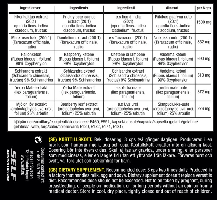 Fikonkaktus extrakt 1500 mg, maskrosextrakt 852 mg, hallonketon 690 mg, Schisandra extrakt 510 mg, yerba mate extrakt 372 mg, mjölon löv extrakt 276 mg.