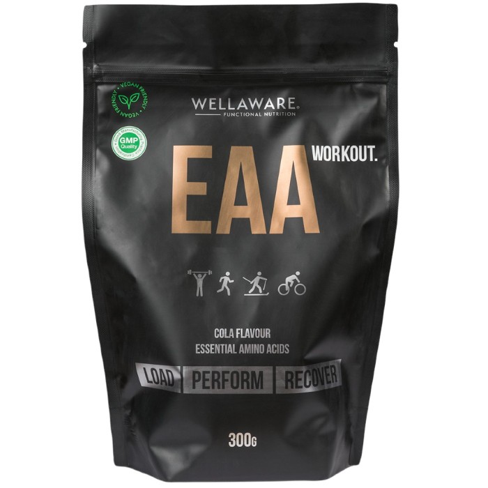 WellAware EAA-pulver med colasmak är ett tillskott med essentiella aminosyror. Inom träningsvärlden har EAA-tillskott blivit populära då aminosyrorna hjälper till att bygga upp och underhålla muskelmassa. När man intar fria aminosyror istället för proteiner når de musklerna snabbt. De essentiella aminosyrorna är sådana som vi behöver få i oss via kosten, eftersom kroppen inte kan tillverka dem. Pulvret innehåller sötningsmedel.