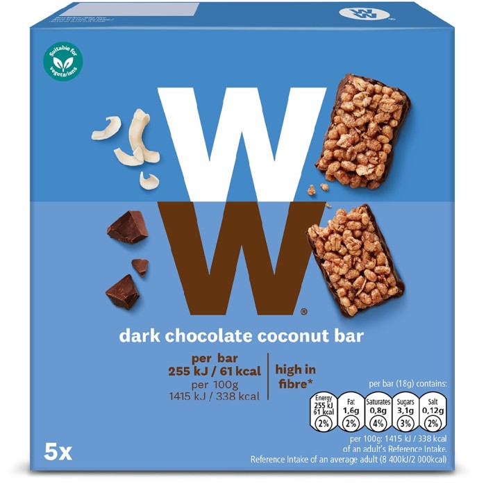WW ViktVäktarna Müslibar med tydlig smak av kokos och en djup smak av mörkchoklad.