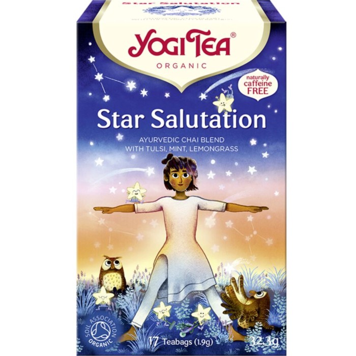 YogiTea Star Salutation är ett koffeinfritt te som kan passar bra som ett komplement till din dagliga yogarutin. Teet har örtiga toner av tulsi kombinerat med friskheten hos mynta och citrongräs, och med lätta, fruktiga toner av rosa grapefruktolja.