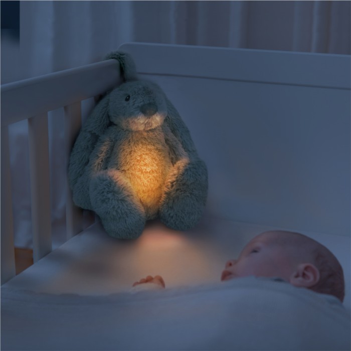 Ro har 10 olika ljud/melodier för att bidra till en rogivande stund och lugna oroliga bebisar: Shush-ljud, hjärtljud, vitt brus, lounge-musik, havets sång, African sunset-sång, andningsljud samt 3 lugnande vaggvisor. Du kan också välja mellan tre volyminställningar. Du kan välja om Ro ska stängas av automatiskt efter 20–40 minuter eller fortsätta lysa och spela ljud hela natten. Kaninen har en gråtsensor med justerbar känslighet. Gråtsensorn gör att Ro automatiskt aktiveras med de senast använda inställningarna när ditt barn börjar gråta. Du kan välja mellan två känslighetsnivåer för att passa er familjs behov.